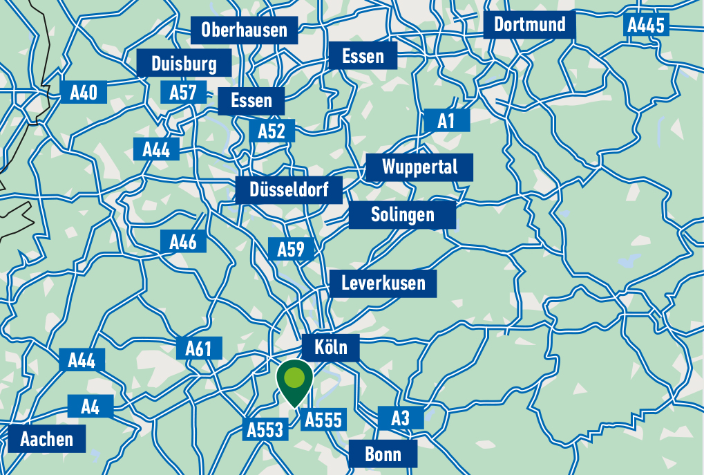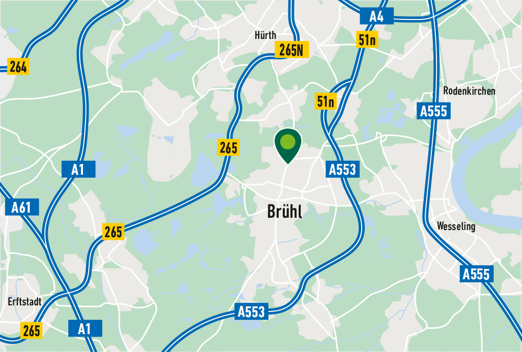 Dank der direkten Anbindung an die A553 und der schnellen Erreichbarkeit der A1 und A61 ist das Grundstück hervorragend in das überregionale Verkehrsnetz eingebunden. Über die nahegelegene A555 ist das Kölner Stadtzentrum in nur etwa 20 Minuten erreichbar, während die Metropolregion Rhein-Ruhr sowie die Benelux-Länder durch die optimalen Autobahnanbindungen ebenfalls in kürzester Zeit bedient werden können.